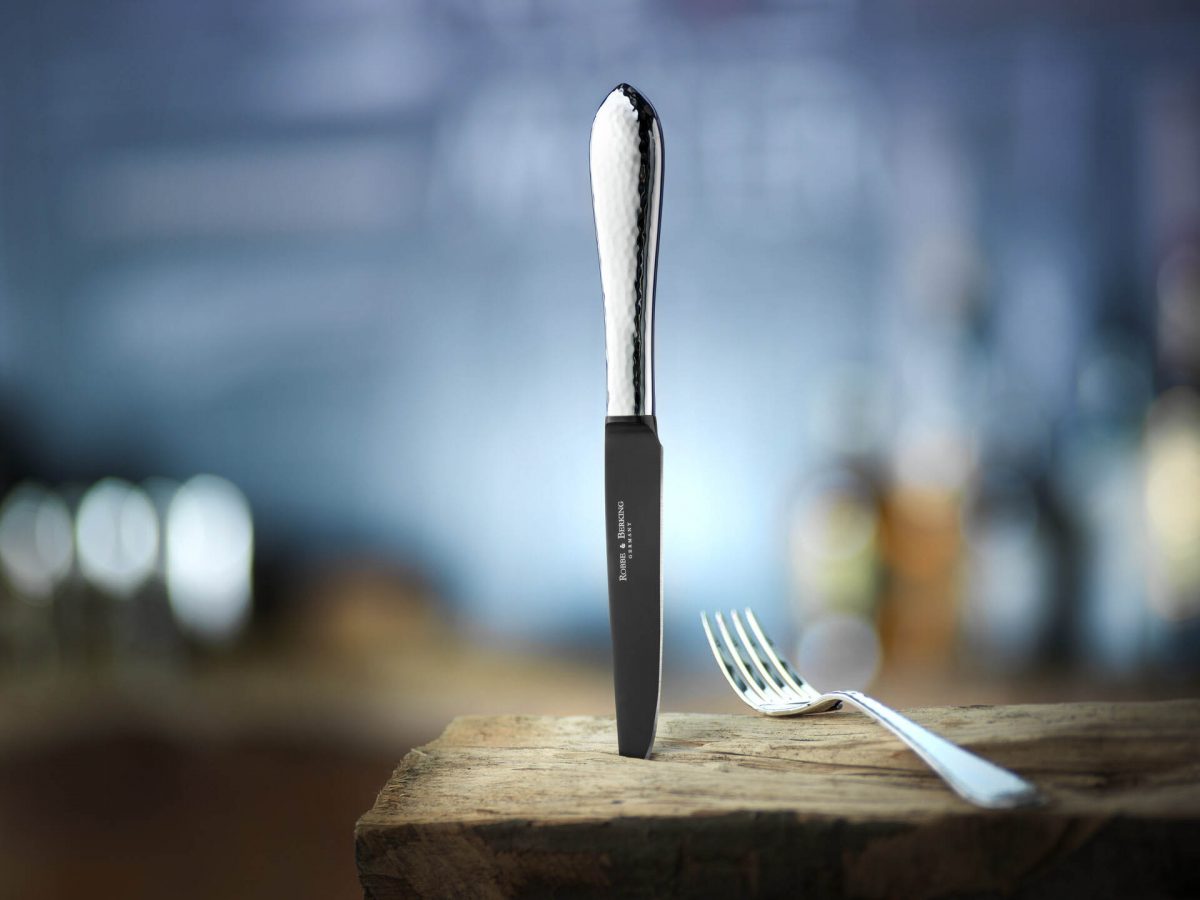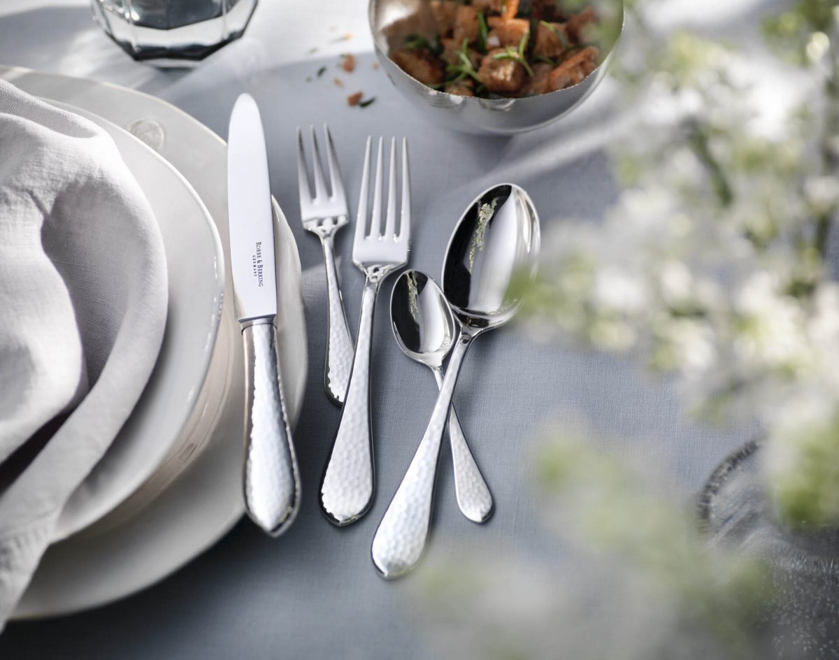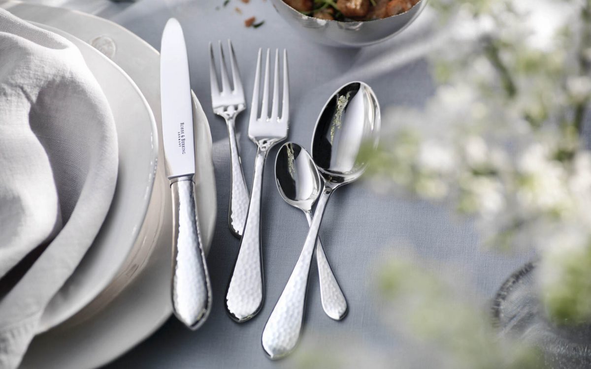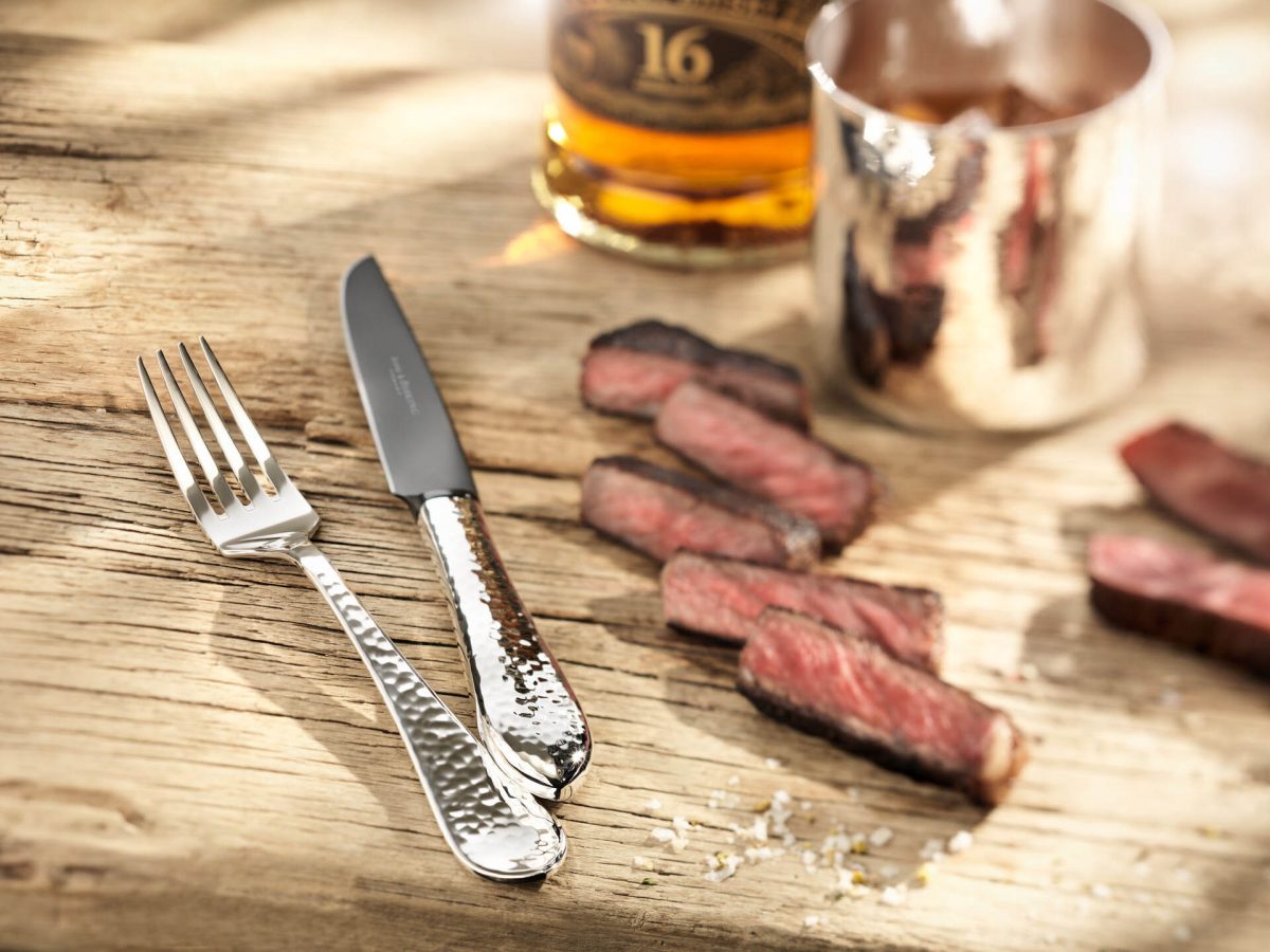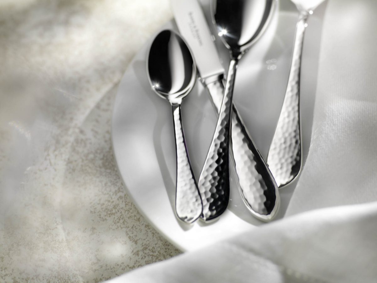 Wir haben für unser Besteck die Serie Martelé der Flensburger Silbermanufaktur Robbe & Berking ausgesucht. Dieses Design gilt als eines der bedeutendsten Meisterstücke moderner Silberschmiedekunst. Grund dafür ist die einzigartige Hammerschlag-Optik, die für ein lebendiges Lichtspiel sorgt, und die außergewöhnliche handwerkliche Qualität.